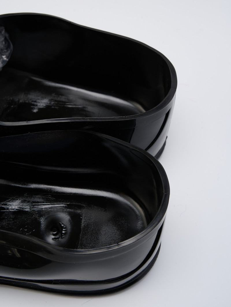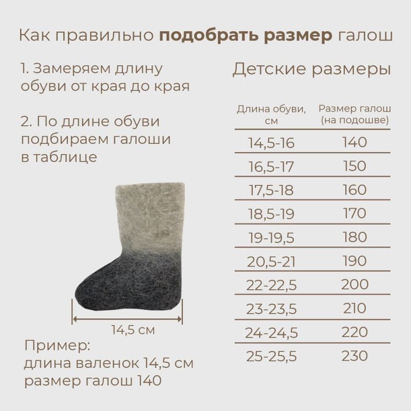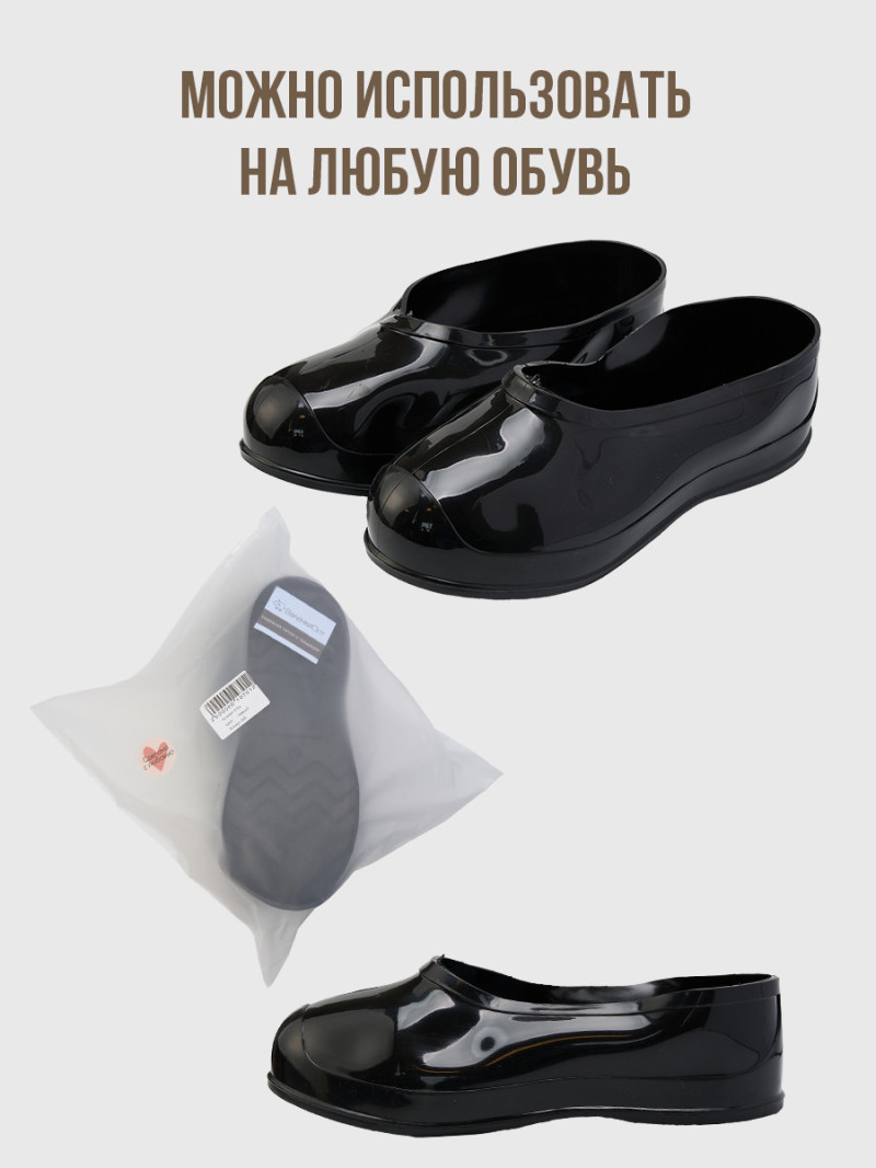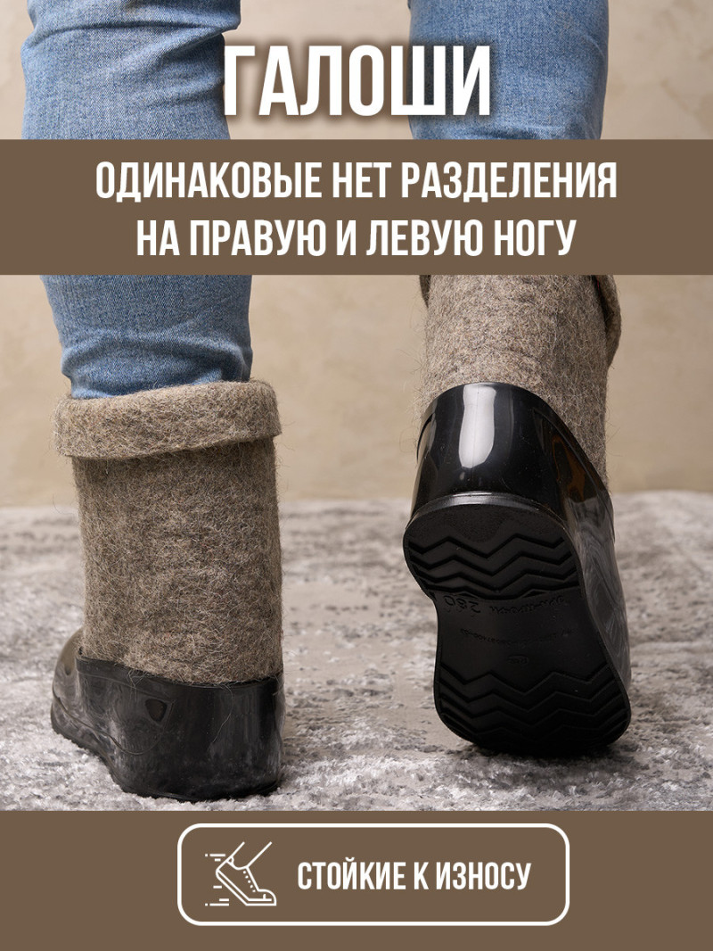 Классические черные галоши изготовлены из ПВХ, который является аналогом резины. В отличие от нее она не трескается, не выгорает на солнце. Хорошо тянутся, плотно одеваются на валенки, крепко сидят, не слезают и не скользят. При выборе галош берите размер в размер в валенками. При отправке мы сами одеваем галоши на валенки.