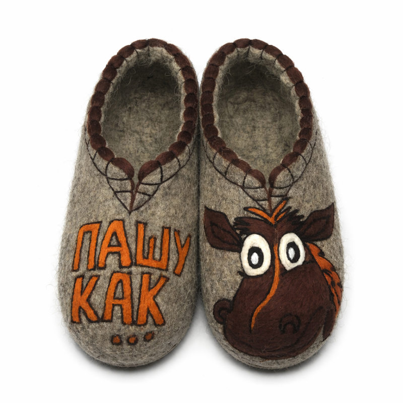 Тапочки мужские "Пашу как..." изготовлены из 100% овечьей шерсти. Шерсть улучшает циркуляцию крови в ногах, снимает усталость и тяжесть. Ноги в тапочках никогда не потеют. Тапочки отлично поддерживают температурный режим, летом в них не будет жарко, а зимой холодно. А яркие рисунки, сделанные вручную нашими дизайнерами будут радовать зимними вечерами. Советуем выбирать тапочки размер в размер с повседневной обувью. Также мы можем вам предложить к данным тапочкам подошву из микропоры, с ним изделие прослужит 2-3 раза дольше. Оплатить ваш заказ вы можете при получении в курьерских службах СДЭК и Boxberry. При выборе способа доставки "Почта России" оплата заказа производится на сайте. Срок возврата товара надлежащего качества составляет 14 дней с момента получения товара. материал: натуральная шерсть температурный диапазон: от -40 до 0 градусов способ изготовления: ручная работа особенности модели: дышащий материал сезон: зима