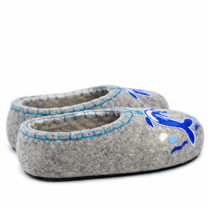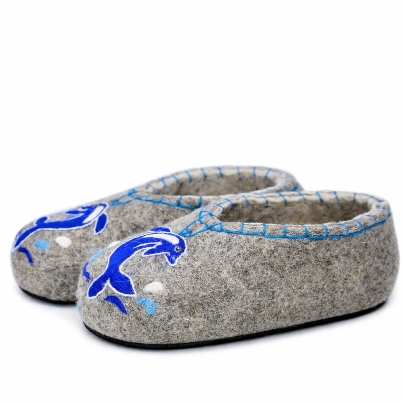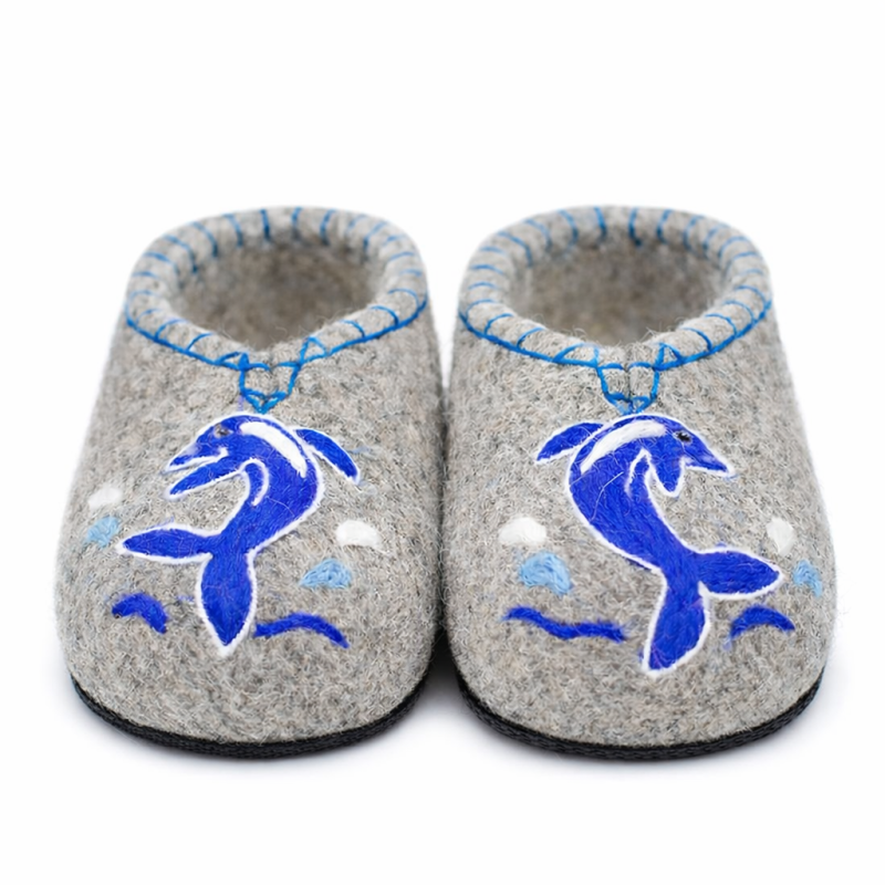 Тапочки женские "Дельфин" изготовлены из 100% овечьей шерсти. Шерсть улучшает циркуляцию крови в ногах, снимает усталость и тяжесть. Ноги в тапочках никогда не потеют. Тапочки отлично поддерживают температурный режим, летом в них не будет жарко, а зимой холодно. А яркие рисунки, сделанные вручную нашими дизайнерами будут радовать зимними вечерами. Советуем выбирать тапочки размер в размер с повседневной обувью. Также мы можем вам предложить к данным тапочкам подошву из микропоры, с ним изделие прослужит 2-3 раза дольше. Оплатить ваш заказ вы можете при получении в курьерских службах СДЭК и Boxberry. При выборе способа доставки "Почта России" оплата заказа производится на сайте. Срок возврата товара надлежащего качества составляет 14 дней с момента получения товара. материал: натуральная шерсть температурный диапазон: от -40 до 0 градусов способ изготовления: ручная работа особенности модели: дышащий материал сезон: зима