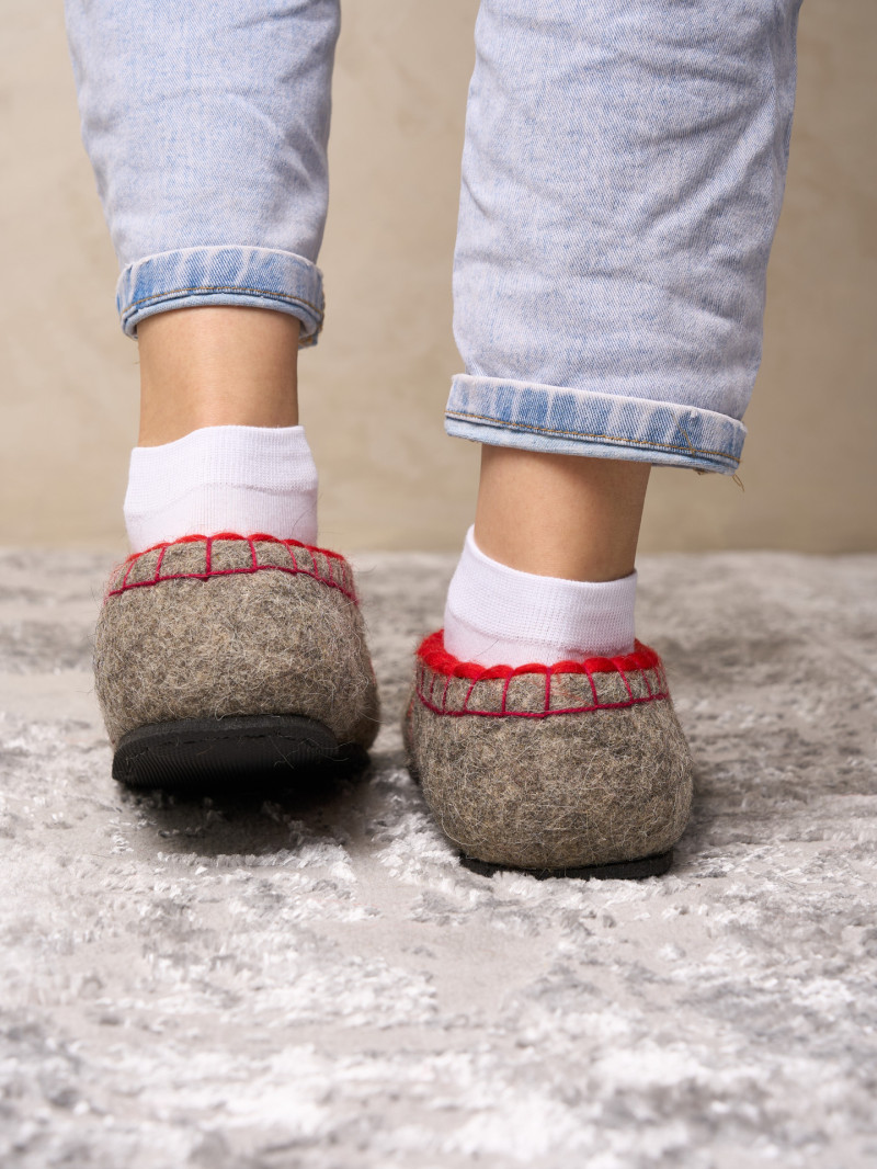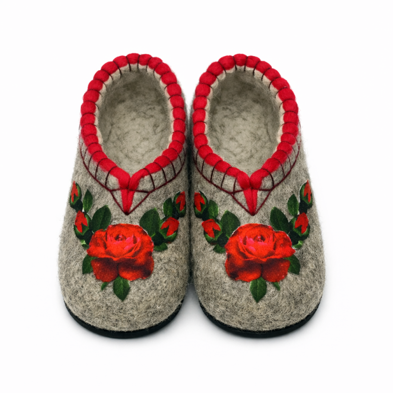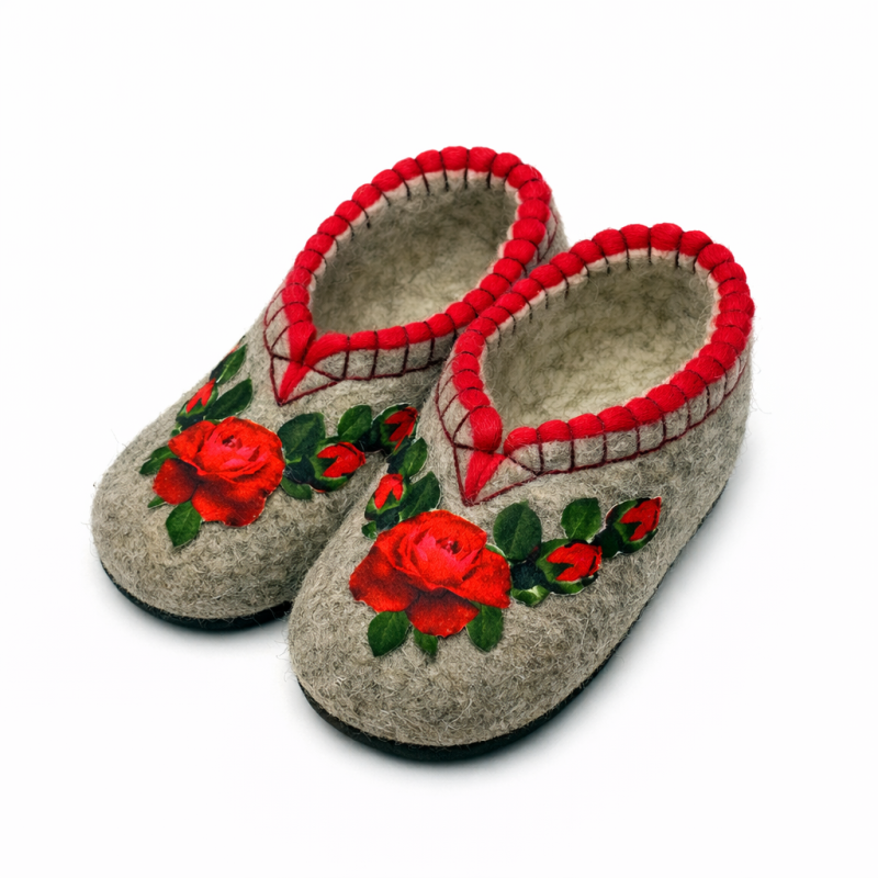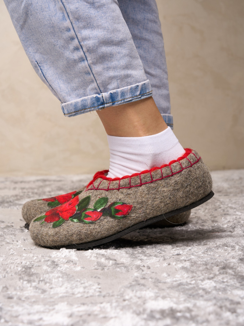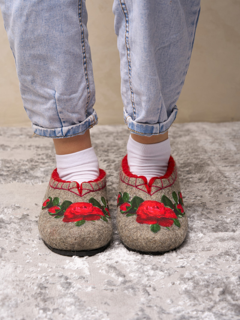 Тапочки женские "Красные розы" изготовлены из 100% овечьей шерсти. Шерсть улучшает циркуляцию крови в ногах, снимает усталость и тяжесть. Ноги в тапочках никогда не потеют. Тапочки отлично поддерживают температурный режим, летом в них не будет жарко, а зимой холодно. А яркие рисунки, сделанные вручную нашими дизайнерами будут радовать зимними вечерами. Советуем выбирать тапочки размер в размер с повседневной обувью. Также мы можем вам предложить к данным тапочкам подошву из микропоры, с ним изделие прослужит 2-3 раза дольше. Оплатить ваш заказ вы можете при получении в курьерских службах СДЭК и Boxberry. При выборе способа доставки "Почта России" оплата заказа производится на сайте. Срок возврата товара надлежащего качества составляет 14 дней с момента получения товара. материал: натуральная шерсть температурный диапазон: от -40 до 0 градусов способ изготовления: ручная работа особенности модели: дышащий материал сезон: зима