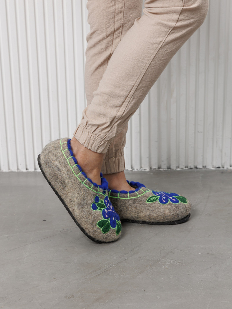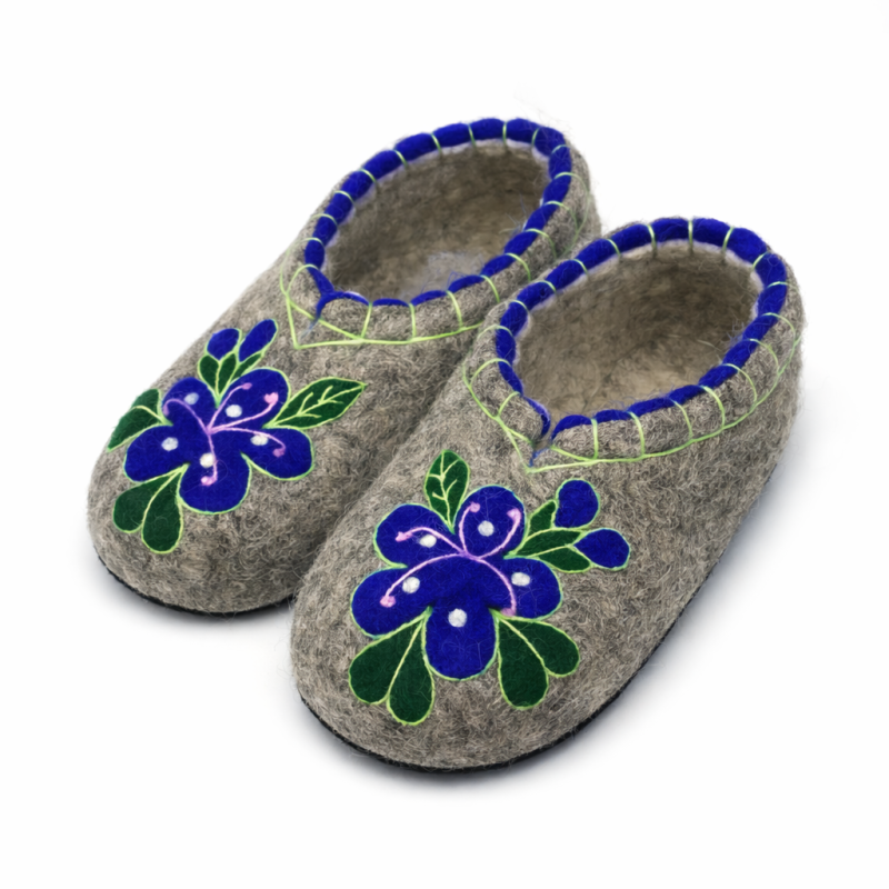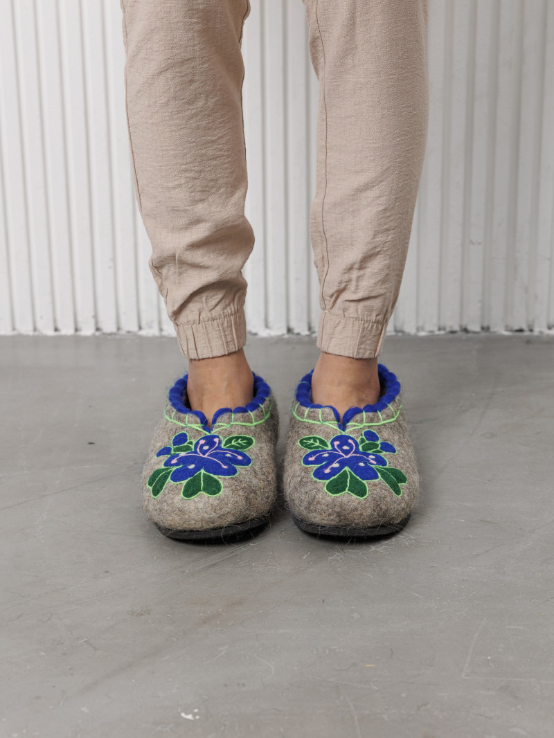Тапочки женские "Незабудка" изготовлены из 100% овечьей шерсти. Шерсть улучшает циркуляцию крови в ногах, снимает усталость и тяжесть. Ноги в тапочках никогда не потеют. Тапочки отлично поддерживают температурный режим, летом в них не будет жарко, а зимой холодно. А яркие рисунки, сделанные вручную нашими дизайнерами будут радовать зимними вечерами. Советуем выбирать тапочки размер в размер с повседневной обувью. Также мы можем вам предложить к данным тапочкам подошву из микропоры, с ним изделие прослужит 2-3 раза дольше. Оплатить ваш заказ вы можете при получении в курьерских службах СДЭК и Boxberry. При выборе способа доставки "Почта России" оплата заказа производится на сайте. Срок возврата товара надлежащего качества составляет 14 дней с момента получения товара. материал: натуральная шерсть температурный диапазон: от -40 до 0 градусов способ изготовления: ручная работа особенности модели: дышащий материал сезон: зима