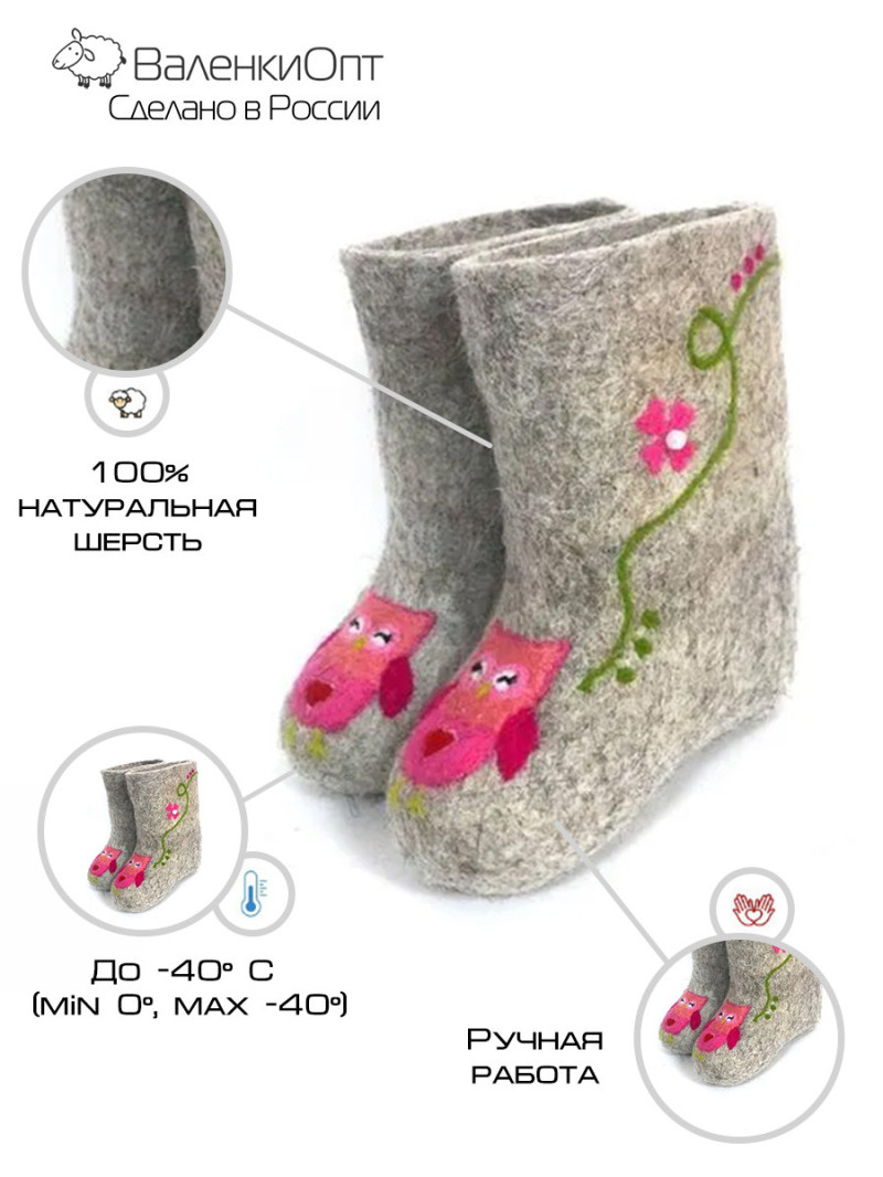 Зима радует морозами, а валенки детские от ВаленкиОпт.ру своим теплом! Чудесные валенки для детей созданы вручную из 100% натуральной овечьей шерсти! Будет идеальным вариантом для вашего малыша: в детский сад, школу или на прогулку. Ножки всегда будут теплыми в сильный мороз или при длительных прогулках. Наши детские валенки будут лучшим выбором обуви на сезон 2022 года! Рекомендуем брать детские валенки с запасом на 1-2 размера, чтобы внутри них оставалось небольшое пространство. К валенкам мы предлагаем галоши, которые продлевают срок службы детских валенок. Обращаем внимание, что галоши не имеют разделения правой и левой ноги Приобрести детские валенки вы можете нажав всего на одну кнопку - "купить в один клик" и далее наш менеджер свяжется с вами, чтобы помочь с выбором размера, подошвы или рисунка. Мы всегда готовы выполнить индивидуальные заказы с рисунками любимых персонажей ваших малышей. Оплатить ваш заказ вы можете при получении в курьерских службах СДЭК и Boxberry. При выборе способа доставки "Почта России" оплата заказа производится на сайте. Срок возврата товара надлежащего качества составляет 14 дней с момента получения товара. материал: натуральная шерсть температурный диапазон: от -40 до 0 градусов способ изготовления: ручная работа особенности модели: дышащий материал сезон: зима